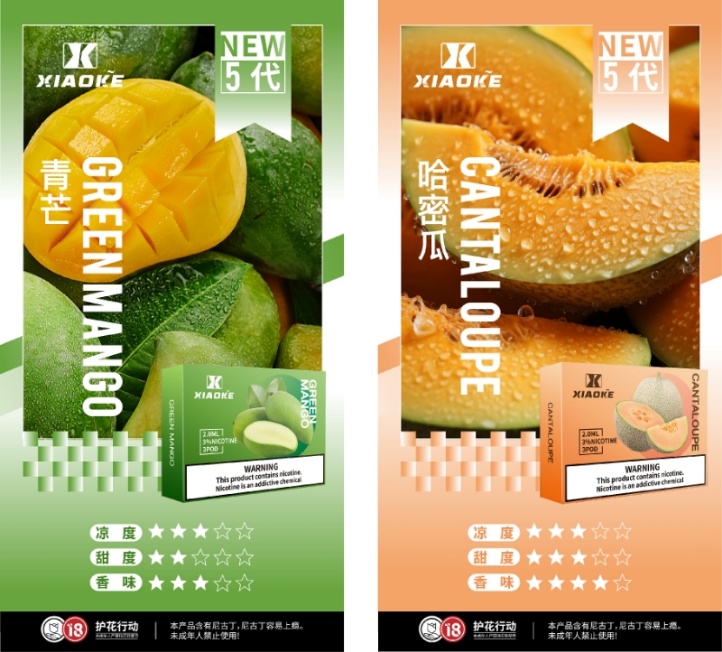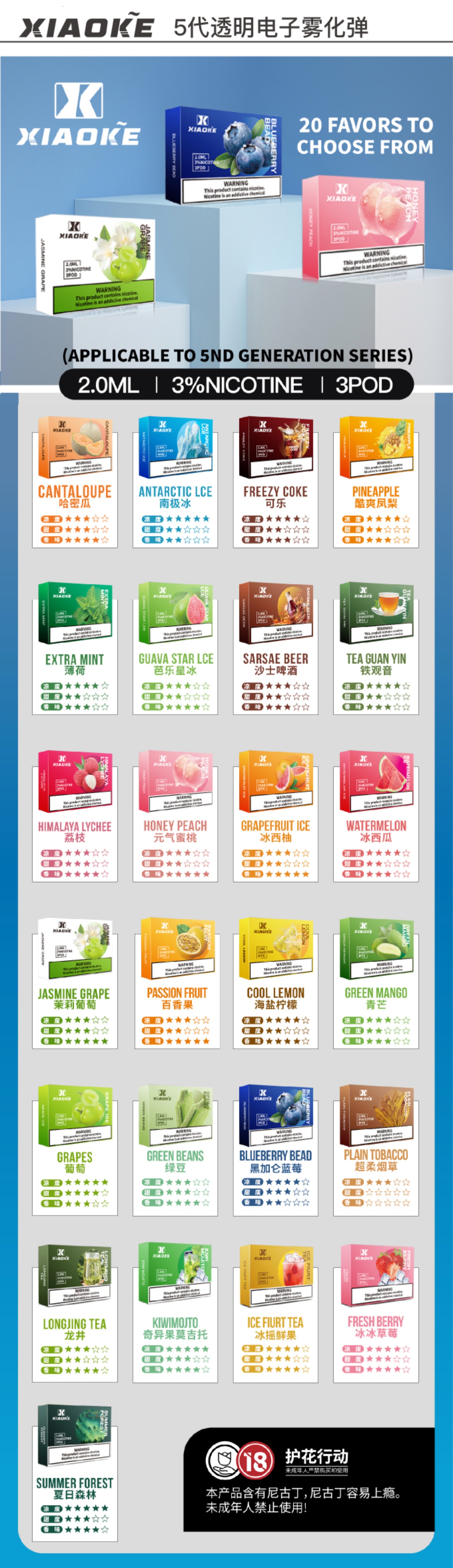 • XIAOKE 5代換彈產品 • 冰涼勁爽 超高還原水果度 • 專利技術:Acode最新超薄陶瓷芯 霧化口感細膩 爆發力強 • 2ml/顆,3顆裝/盒 • 透明奶嘴級PCTG材料,品質過硬 • 3%尼古丁系列 • 陸續驚喜口味持續上新